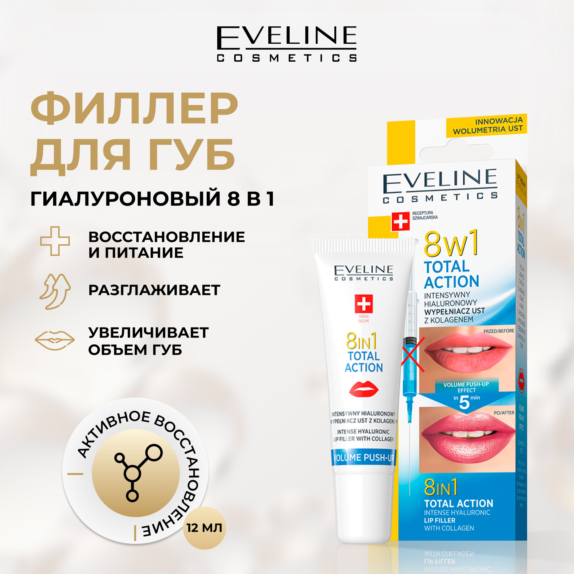 EVELINE Lip Therapy Professional Гиалуроновый филлер для губ с коллагеном Total Action 8в1