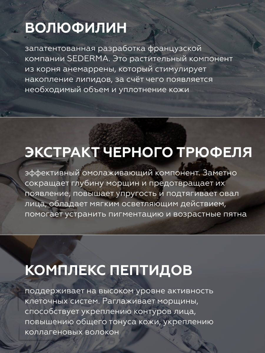 | Состав | Aureobasidium Pullulans Ferment Extract, Tuber Melanosporum Extract, Butylene Glycol, Hydrogenated Polyisobutene,1,2-Hexanediol, Panthenol, Dimethicone, Cetearyl Olivate, Sorbitan Olivate, Water, Sodium, Acrylate/Sodium Acryloyldimethyl Taurate Copolymer, Arginine, Glutathione, Isohexadecane, Ceteareth-20, Sodium Hyaluronate, Polysorbate 80 , Simmondsia Chinensis (Jojoba) Seed Oil, Helianthus Annuus(Sunflower) Seed Oil, Tocopheryl Acetate,Allantoin, Argania Spinosa Kernel Oil, Olea Europaea (Olive) Fruit Oil, Perfume, Adenosine,Ethylhexylglycerin, Disodium EDTA, Olea Europaea (Olive) Husk Oil, Tocopherol, Anemarrhena Asphodeloides Root Extract, Caprylyl Glycol, Acetyl Octapeptide-3, Acetyl Hexapeptide-8, Acetyl Hexapeptide-22, Oligopeptide-28, sh-Pentapeptide-19, sh-Octapeptide-4, Caffeyol Tripeptide-1,sh-Decapeptide-7,Sh-Oligopeptide-1. |