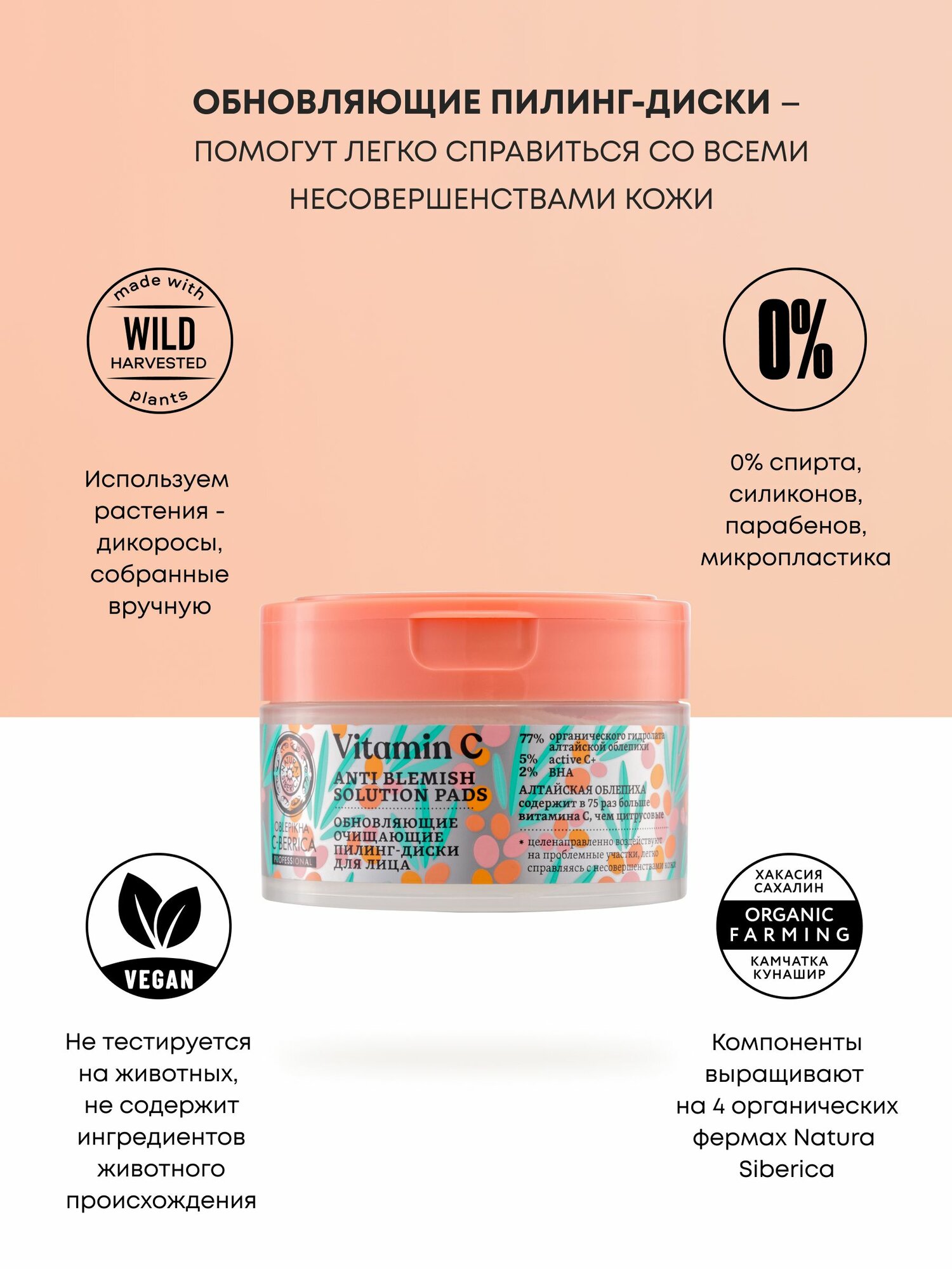 Natura Siberica Oblepikha C-BERRICA Пилинг пэды для лица от постакне с салициловой BHA кислотой и витамином С, обновляющие очищающие диски 20 шт информация: