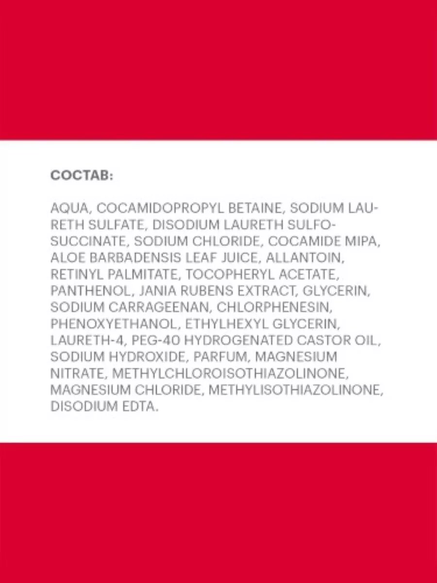 | Состав | aqua, cocamidopropyl betaine, sodium laureth sulfate, disodium laureth sulfosuccinate, sodium chloride, cocamide mipa, aloe barbadensis leaf juice, allantoin, retinyl palmitate, tocopheryl acetate, panthenol, jania rubens extract, glycerin, sodium carrageenan, chlorphenesin, phenoxyethanol, ethylhexyl glycerin, laureth-4, peg-40 hydrogenated castor oil, sodium hydroxide, parfum, magnesium nitrate, methylchloroisothiazolinone, magnesium chloride, methylisothiazolinone, disodium edta |