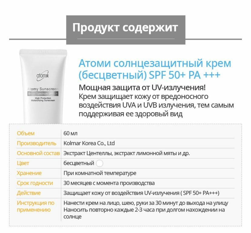 ATOMY / атоми Солнцезащитный Крем SPF50 (бесцветный) / Atomy Sunscreen информация: