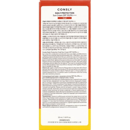 Солнцезащитный крем Consly с муцином улитки SPF 50+/PA+++ для комбинированной и жирной кожи, 50 мл информация: