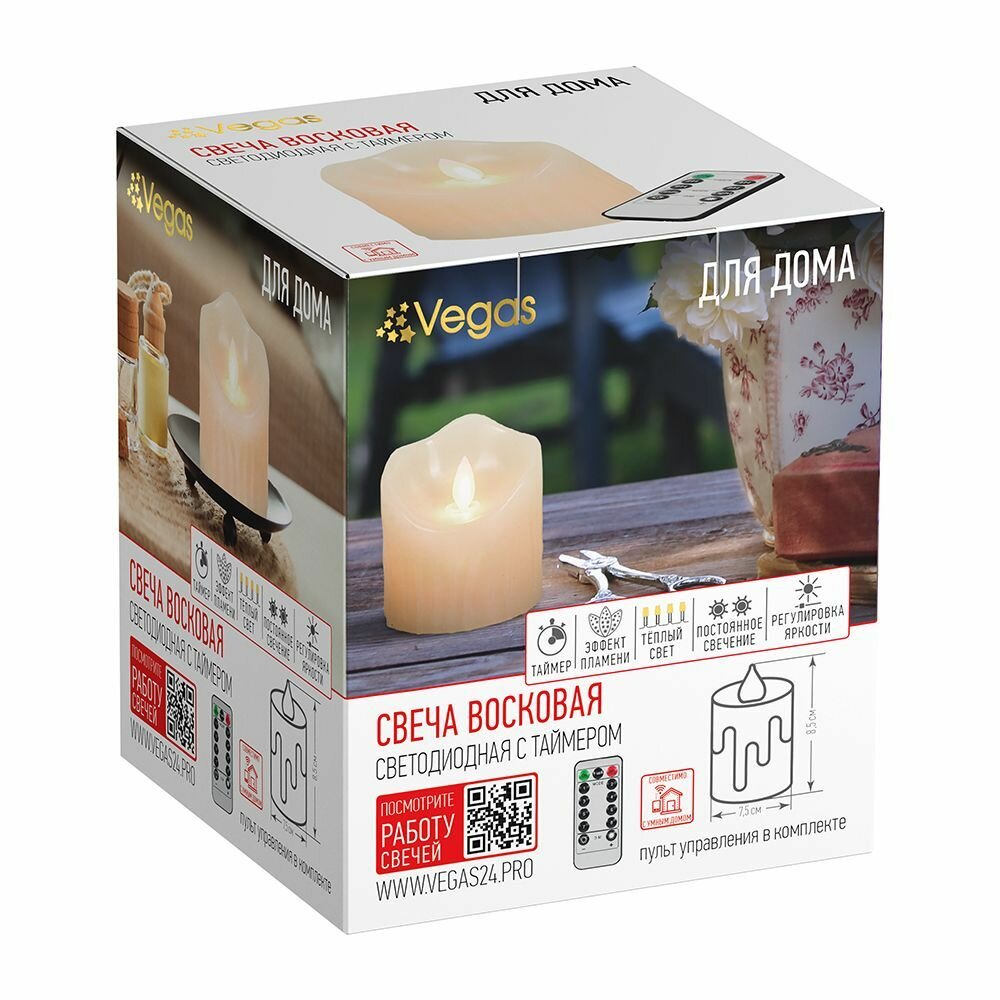 Свеча светодиодная VEGAS многофункциональная, воск, 7.5х8.5 см, без батарейки, с пультом ДУ информация: