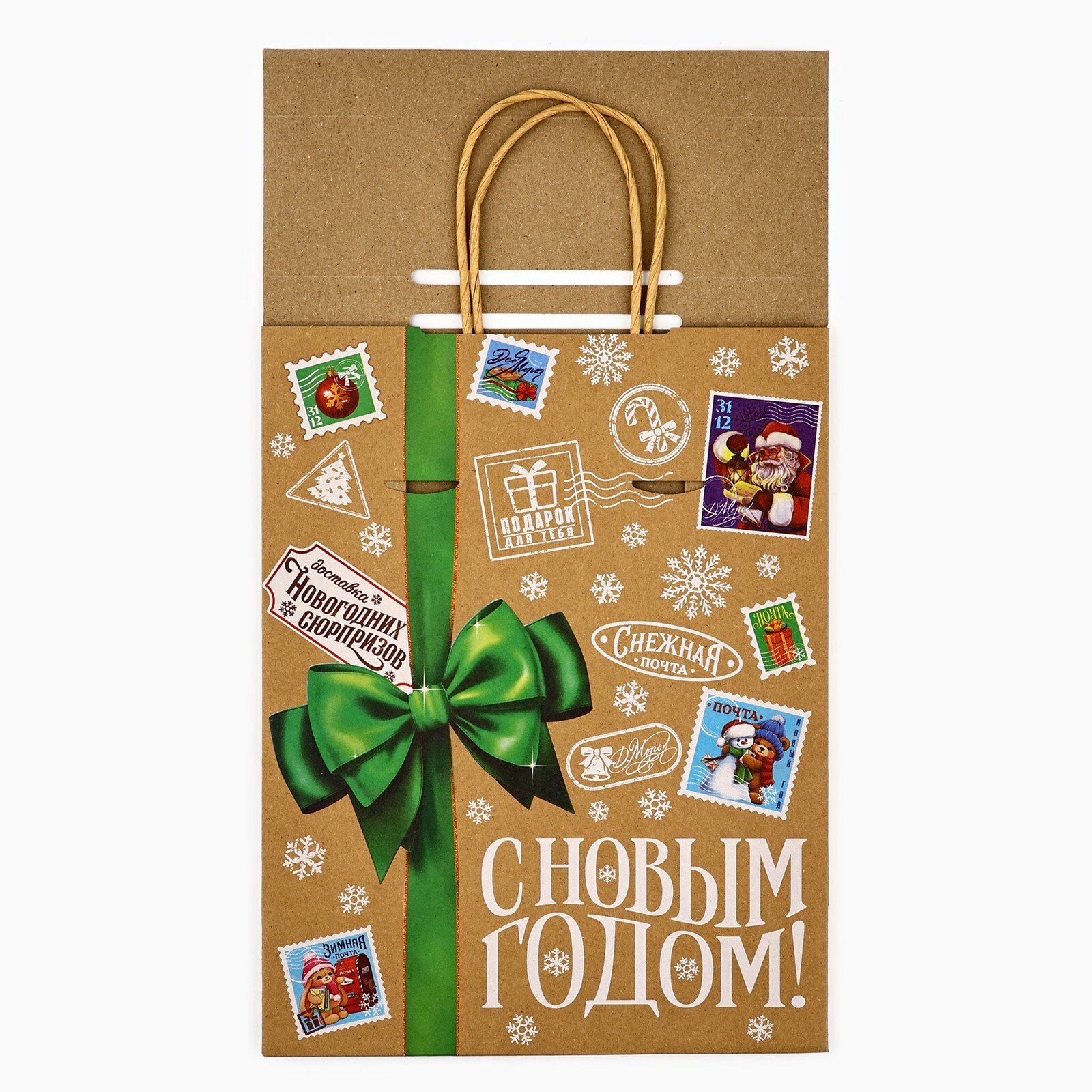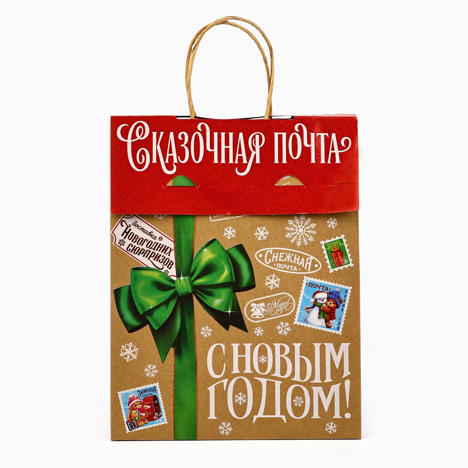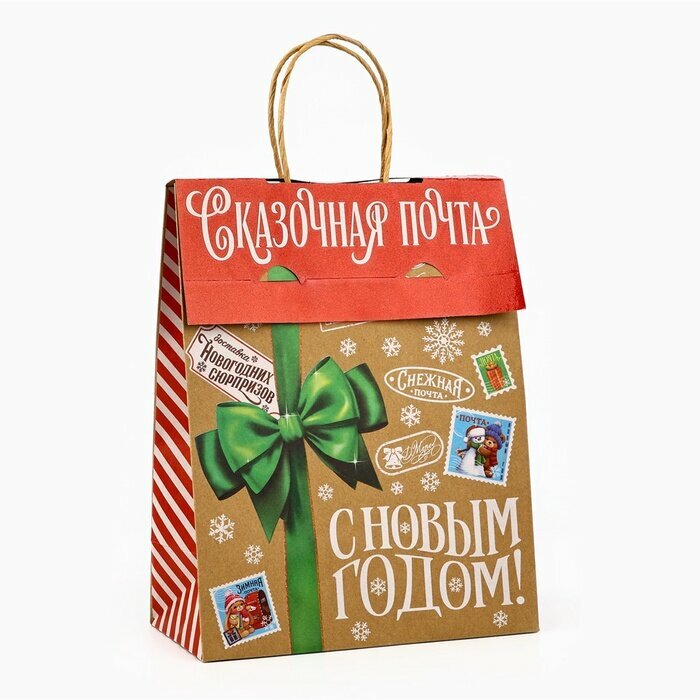 Подарочный пакет с клапаном «Новогодняя почта», крафт, глиттер, 19.5 х 10 х 25 см, для упаковки подарка на Новый Год информация: