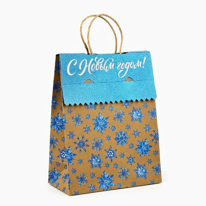 Подарочный пакет с клапаном «Снежинки», крафт, глиттер, 19.5 х 10 х 25 см, для упаковки подарка на Новый Год информация: