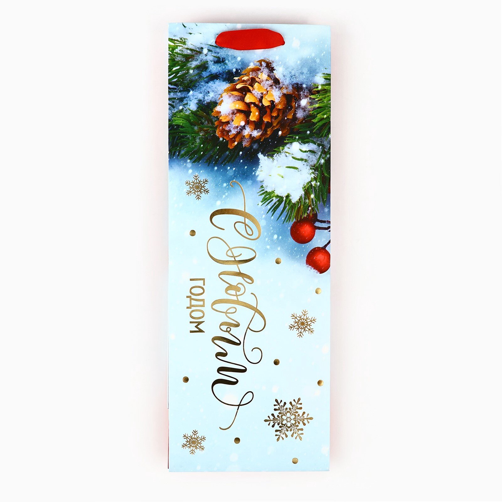 Подарочный пакет новогодний ламинированный, «Снежный лес», 13 x 36 x 10, под бутылку, для упаковки подарка на Новый Год информация:
