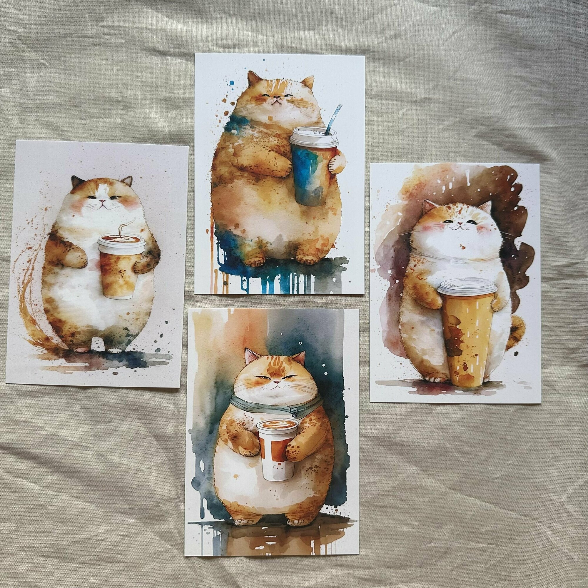 Открытки "Котики пьют кофе" (4 шт., яркая печать) - Набор для посткроссинга, милые коты