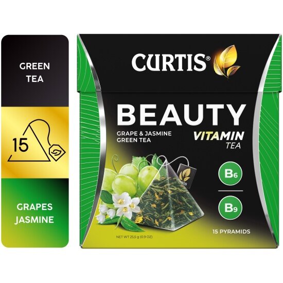 Чай зеленый Curtis "Beauty" с кусочками винограда и витаминами В6 В9 фруктовый ароматизированный 15 пирамидок информация: