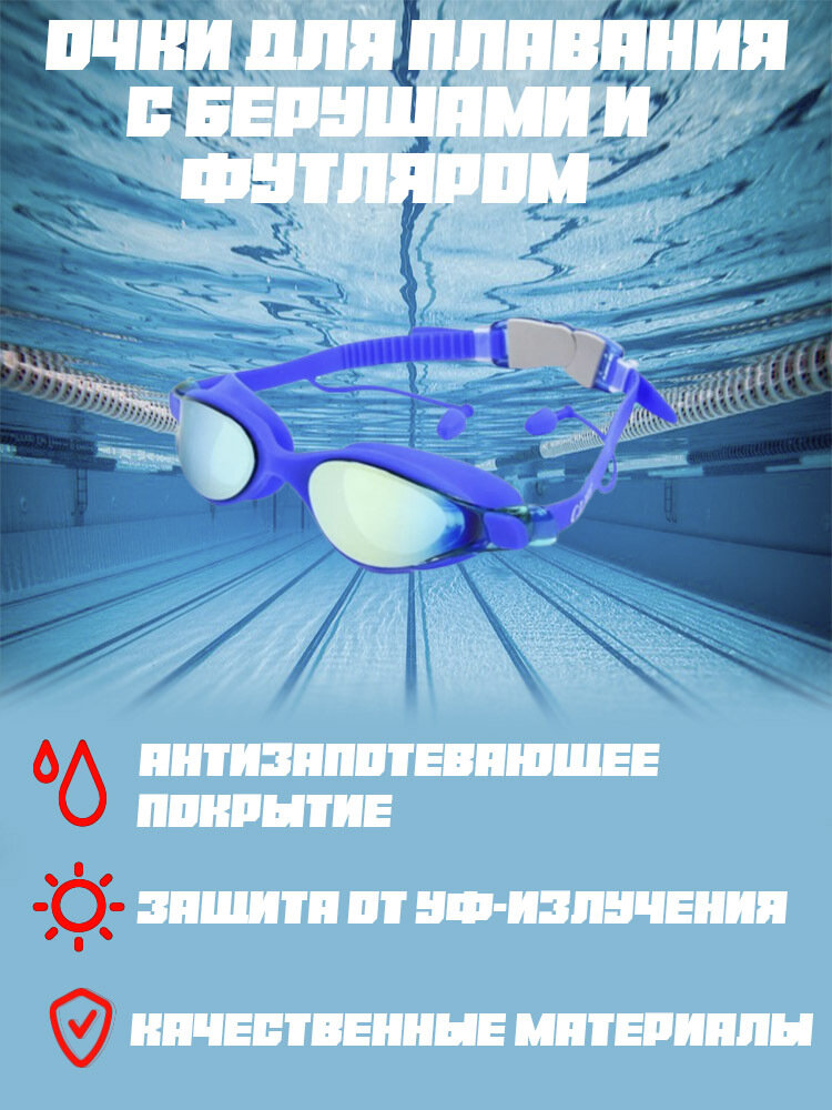 Очки для плавания с чехлом и берушами взрослые, женские, мужские, детские, CLIFF 101M синие / плавательные очки для бассейна информация: