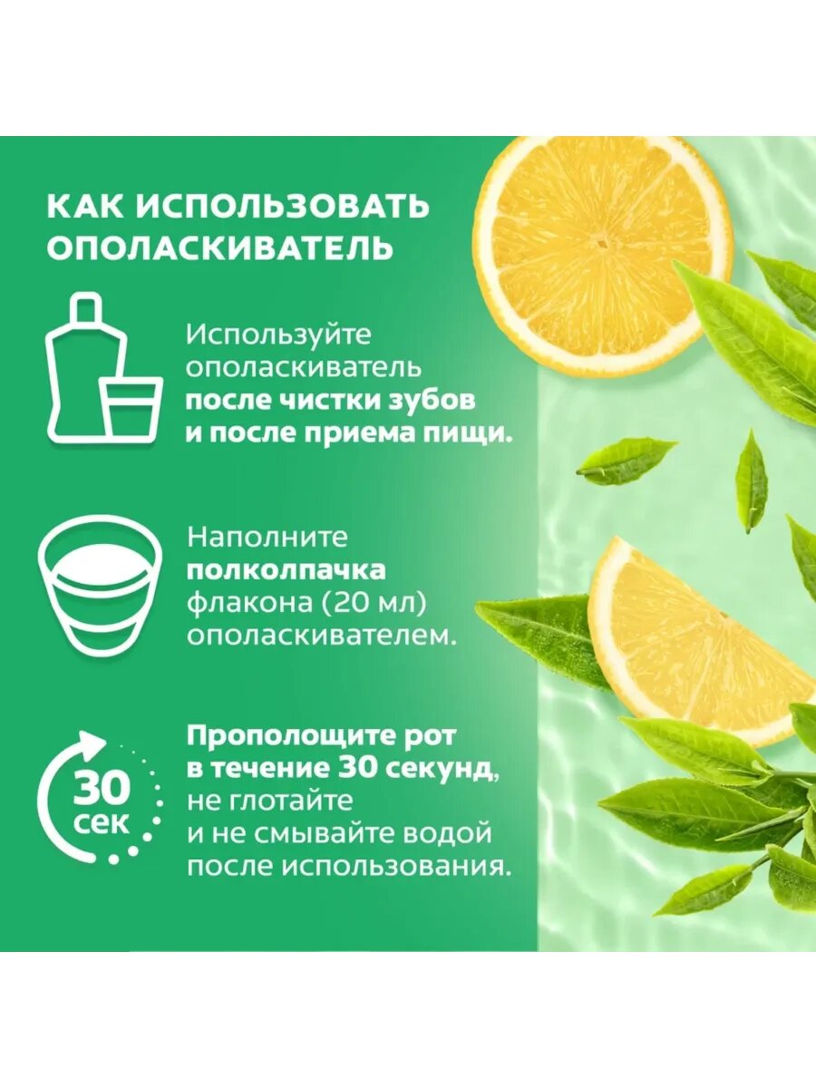 | Состав | Aqua, Glycerin, Propylene Glycol, Sorbitol, Poloxamer 407, Aroma, Sodium Saccharin, Cetylpyridinium Chloride, Potassium Sorbate, Sodium Fluoride (225 ppm F-), Menthol, Camellia Sinensis leaf extract, Citrus Limon peel oil, CI 19140, CI 42051 |