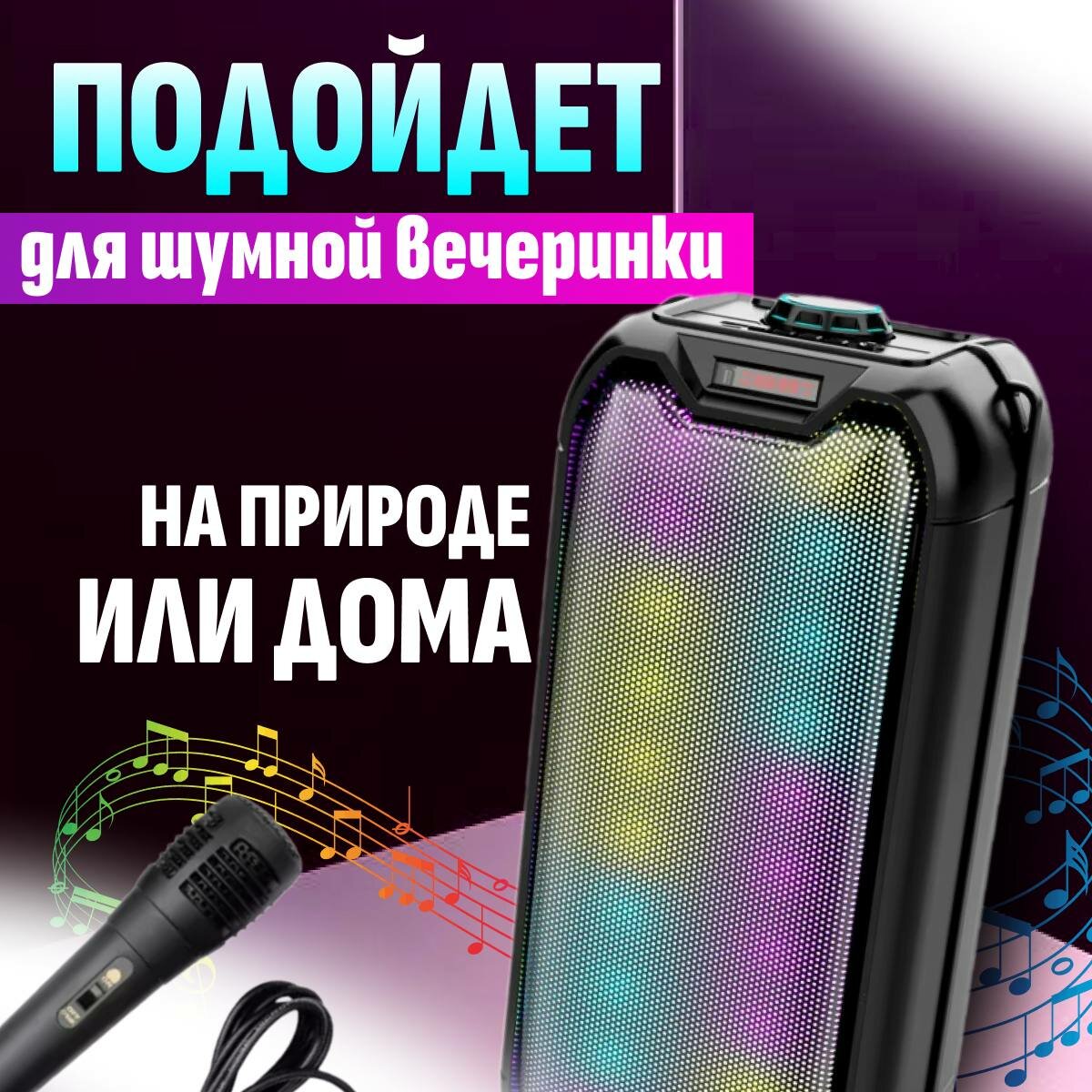 | Особенности | FM-радио / дисплей / караоке / поддержка microSD / режим Power Bank / ремешок / ручка / световые эффекты |