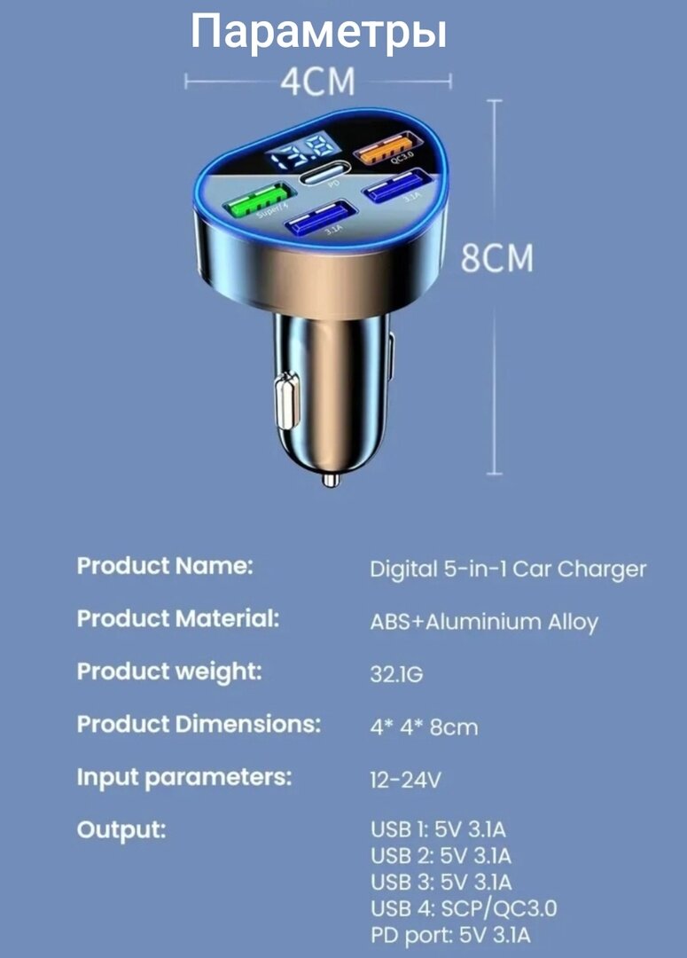 | Особенности | автомобильный вольтметр / Быстрая зарядка / подсветка |