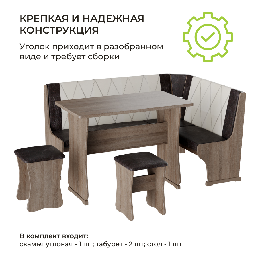 Кухонный уголок BONMEBEL Гамма Тип 2, ЛДСП Дуб Сонома трюфель/КЗ Шоколад/Бежевый, стол, диван, табуреты информация: