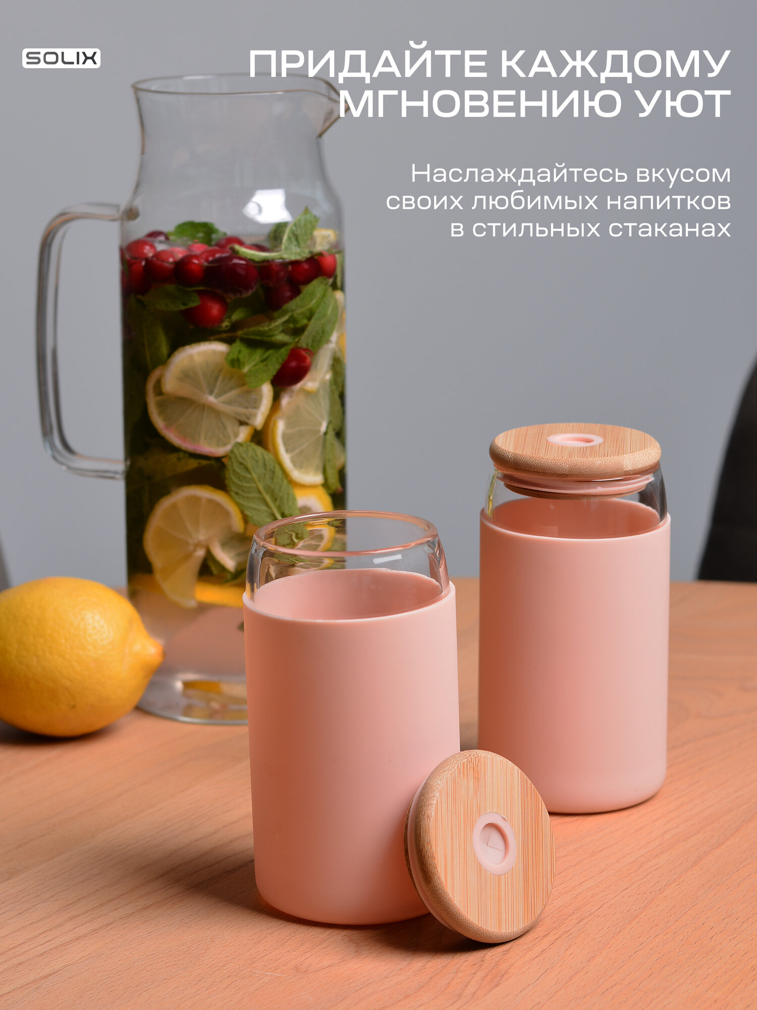 Стеклянные стаканы с бамбуковой крышкой, розовый, 2шт 1 099 ₽