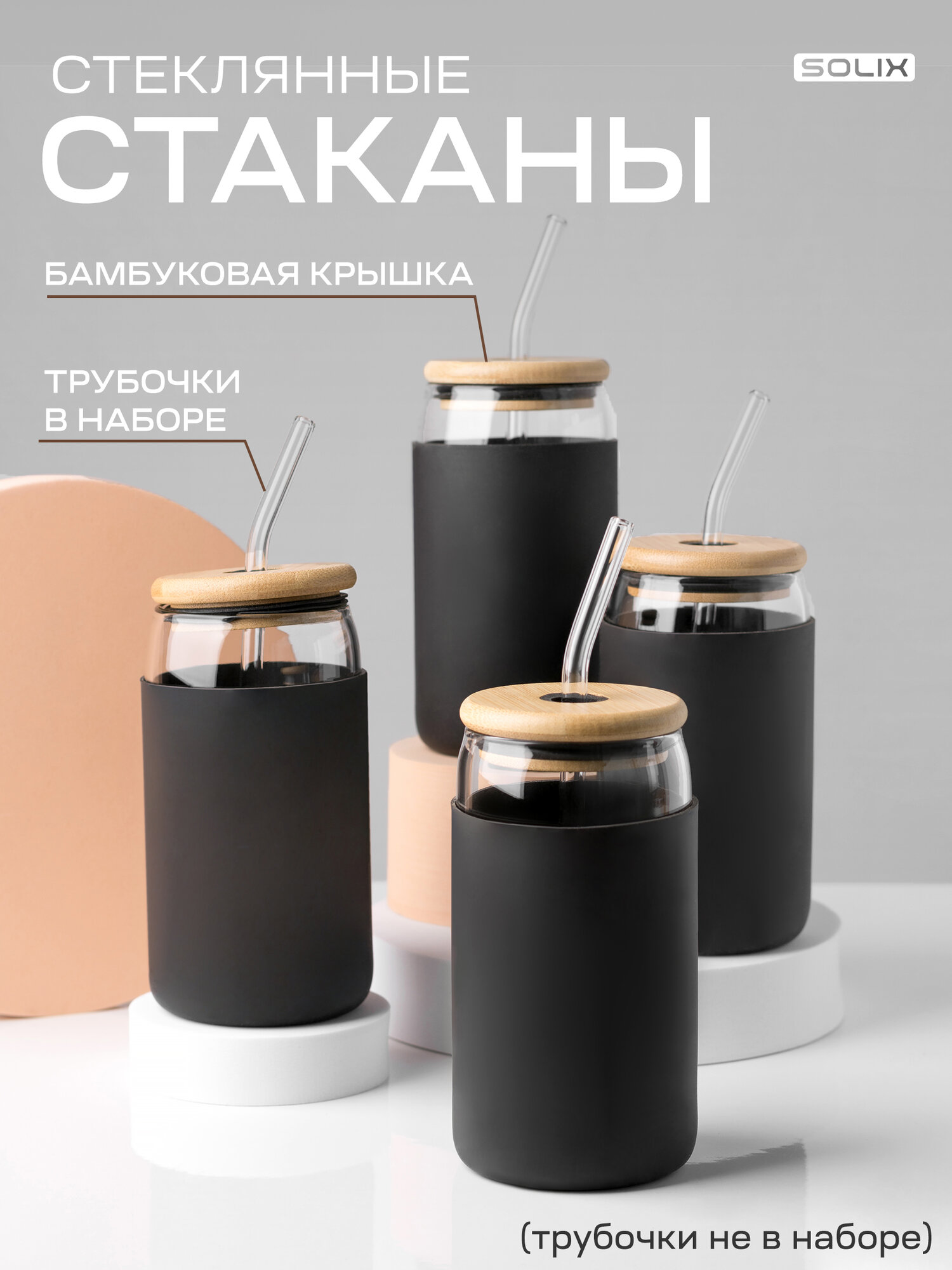 Стеклянные стаканы с бамбуковой крышкой, черный, 4шт информация: