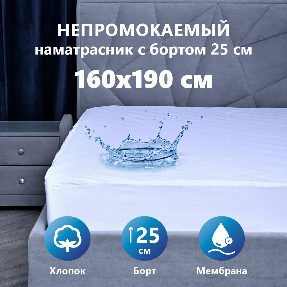 Наматрасник 160х190 см защитный водонепроницаемый Мулетон-Аквастоп, с бортом м/ф 25см. Чехол на матрас натяжной, непромокаемый, с резинкой по всему периметру. 1 457 ₽