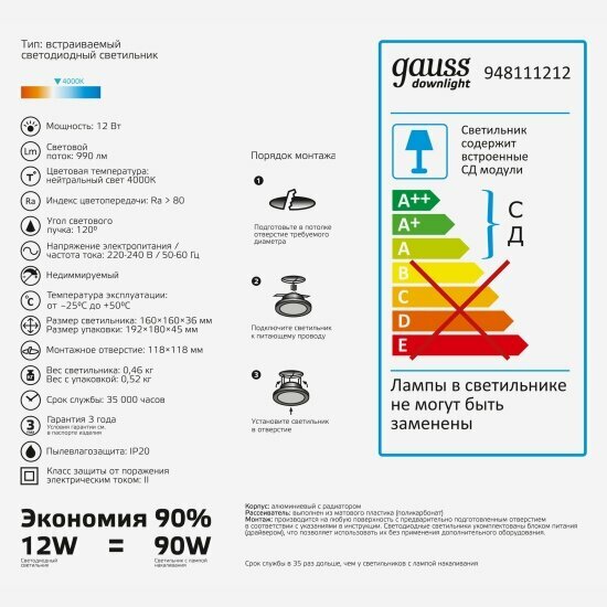 Светильник Gauss 948111212 12Вт 4000K цв.св.:белый нейтральный белый 1 888 ₽