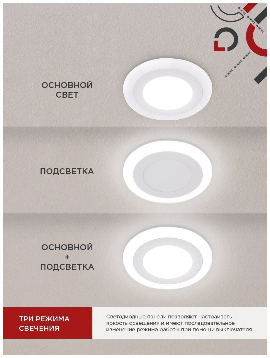 IN HOME Панель сд встраиваемая круглая RLP-BL 9Вт 230В 4000К 540Лм 145мм с подсветкой белая IP20 (арт. 4690612032962) 509 ₽