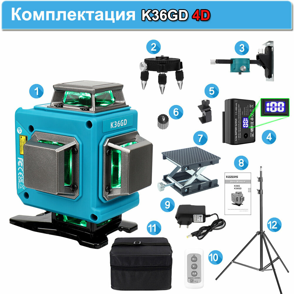 Лазерный уровень/нивелир KEZERS K36GD, Зеленый луч 360 4D 16 Линий, штатив 1,6 м информация: