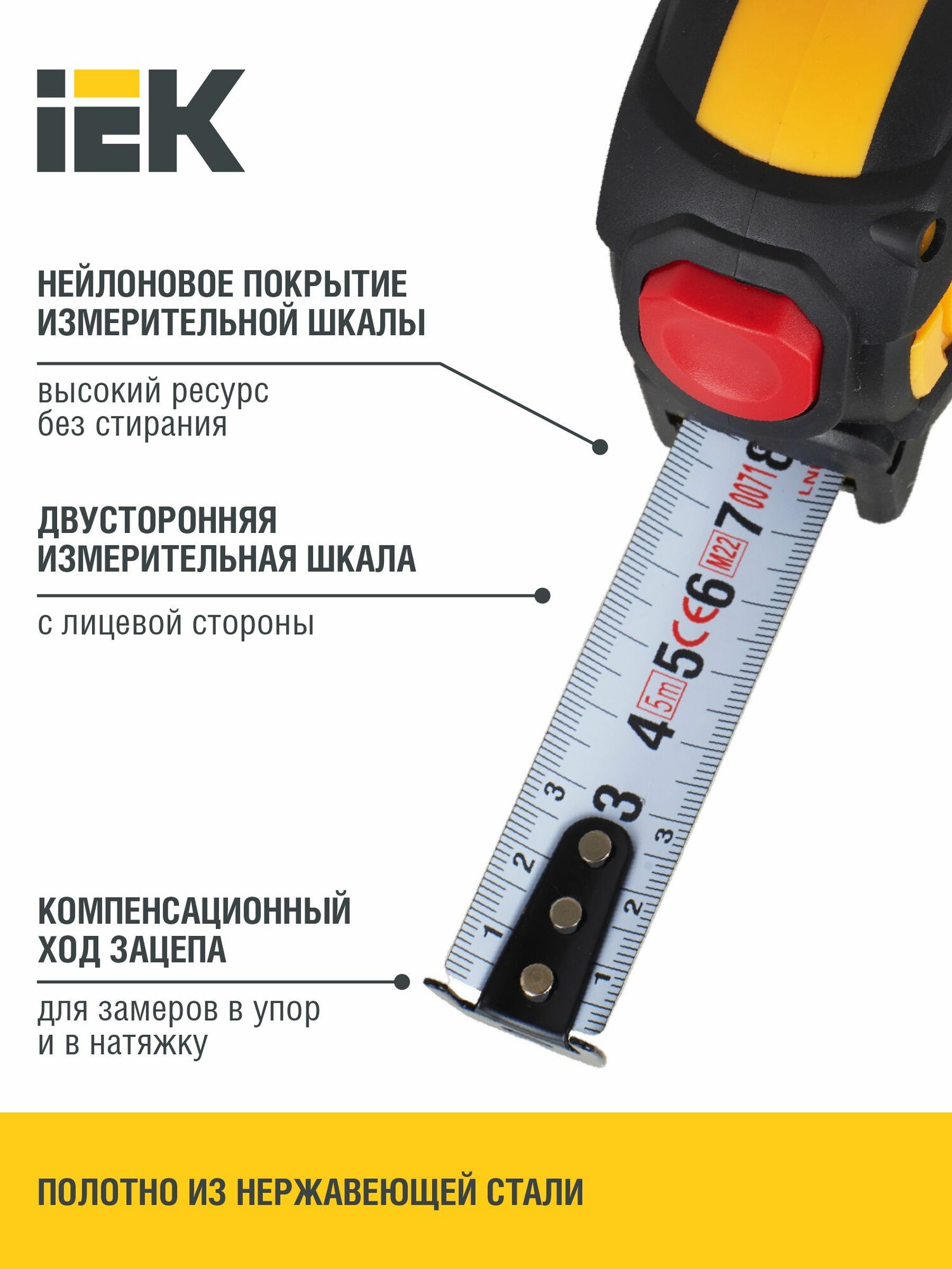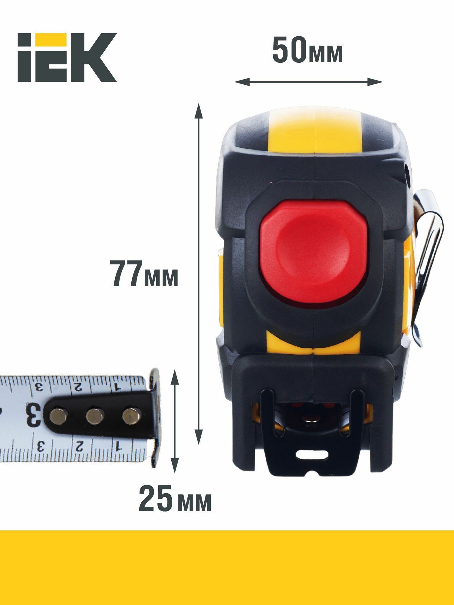 | Дополнительная информация | Рулетка измерительная используется в строительстве, ремонте, промышленности для проведения разметочных работ, измерения линейных размеров. Рулетка IEK защищена ударопрочным эргономичным корпусом с фиксатором. Оснащена тканевым ремешком для ношения на запястье, а также металлической клипсой для фиксации на ремне. Нейлоновое покрытие. Самозажимной фиксатор. Прорезиненный ударопрочный корпус. Двусторонняя шкала. |