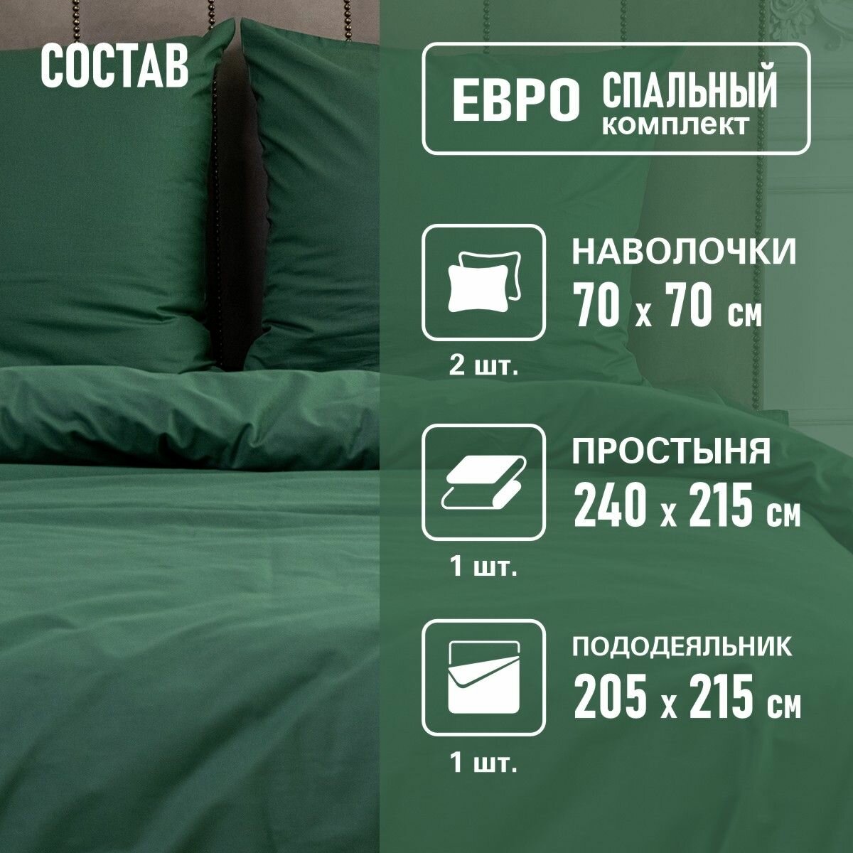 Постельное белье ЕВРО BRAVO поплин зеленый/ хлопок / наволочки 70х70 информация: