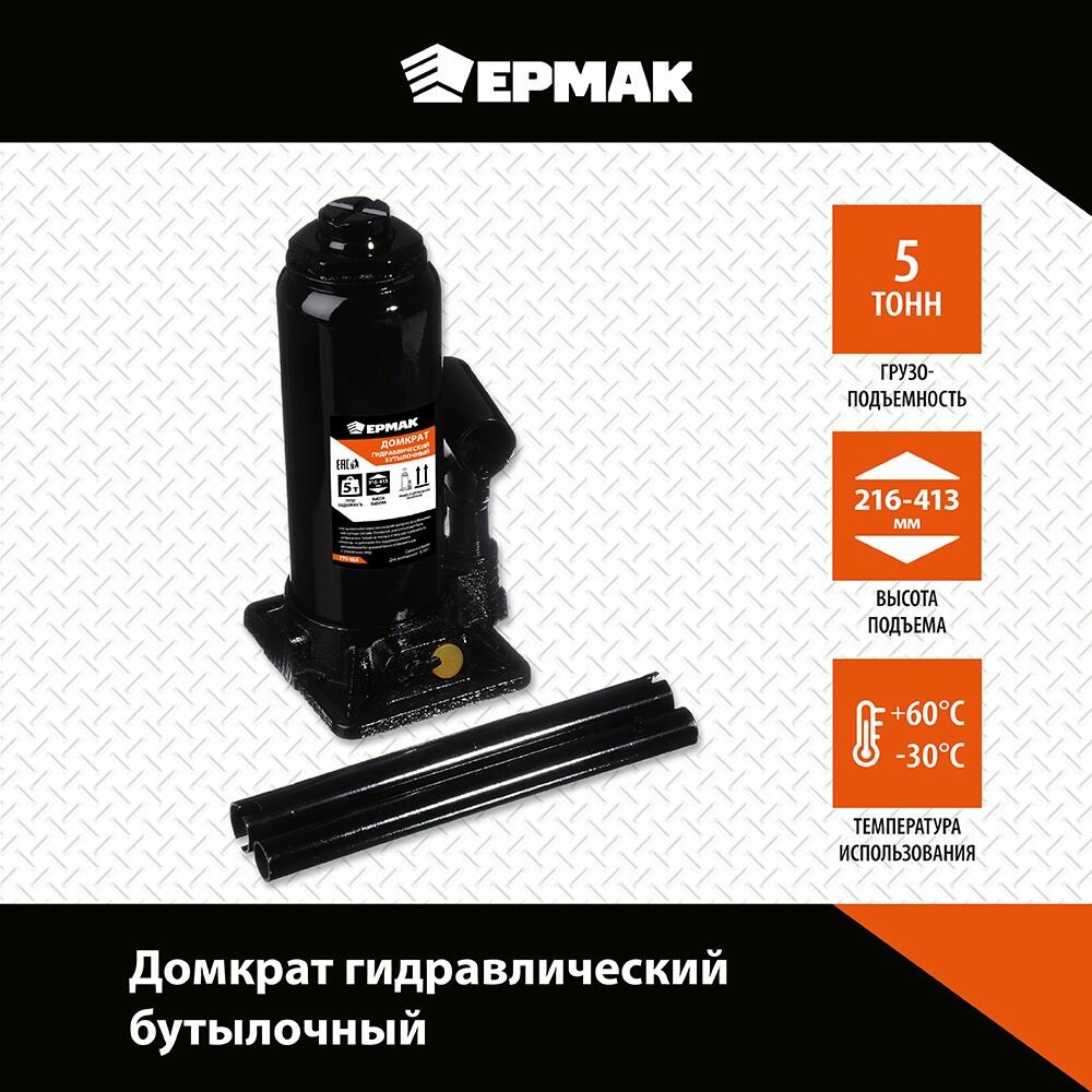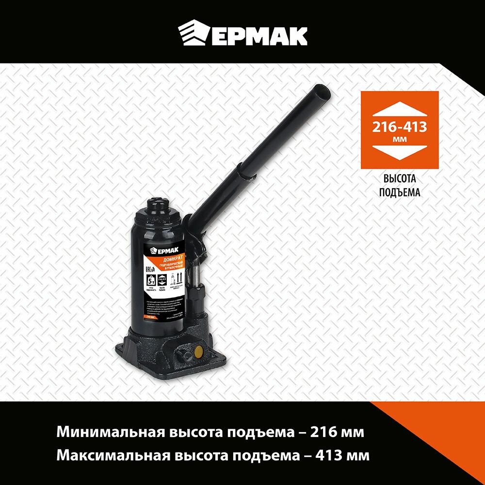 Домкрат гидравлический бутылочный ермак, 770-084, высота подъема 216-413 мм, 5 т информация: