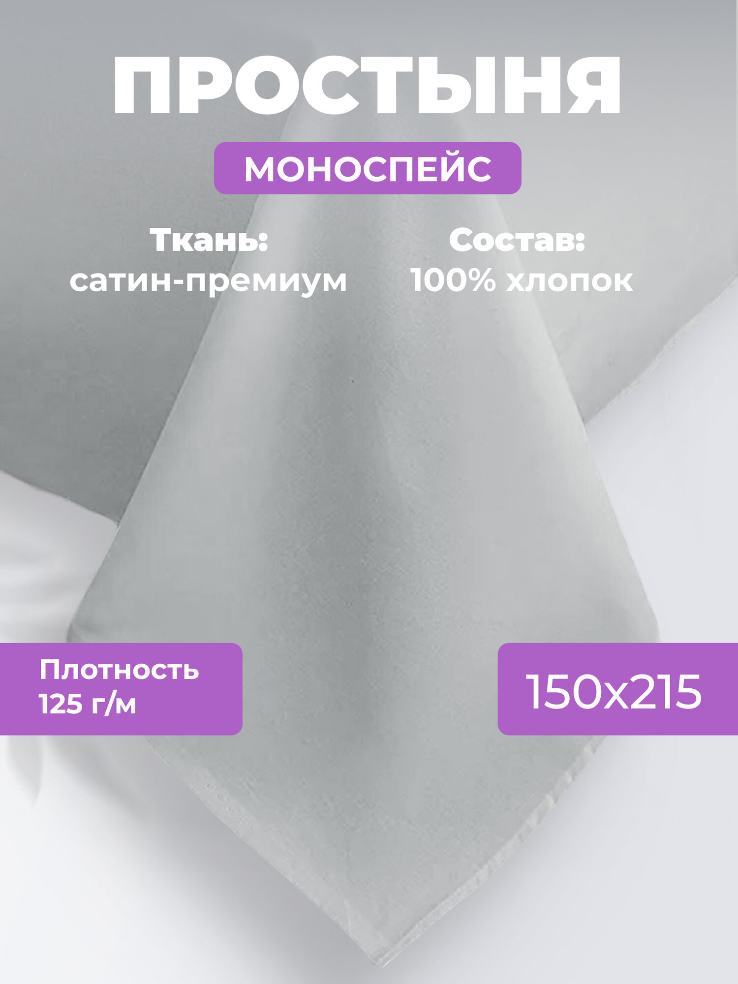 10 цен на Простыня однотонная Моноспейс (аналог икеа), Серый, 1,5 спальное, 150х215 ,100% хлопок, сатин, Ecotex