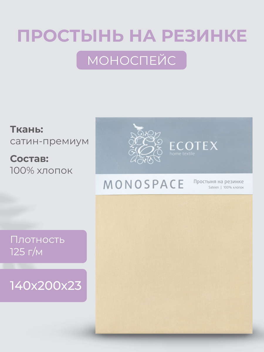 Простынь на резинке Ecotex "Моноспейс", сатин - 100% хлопок, 140х200х23 бежевый 1 621 ₽