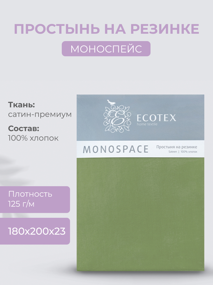 Простынь на резинке Ecotex "Моноспейс", сатин - 100% хлопок, 90х200х23, зеленый 1 196 ₽
