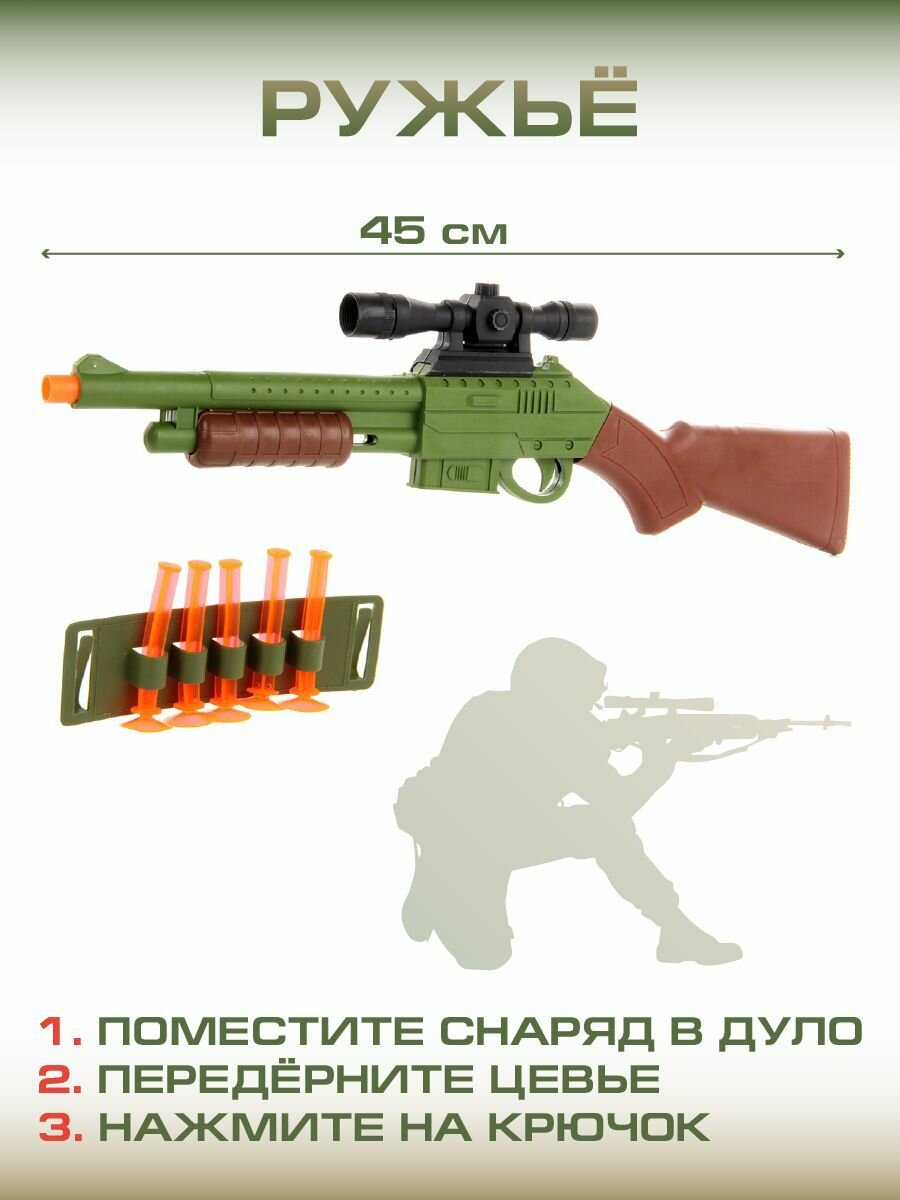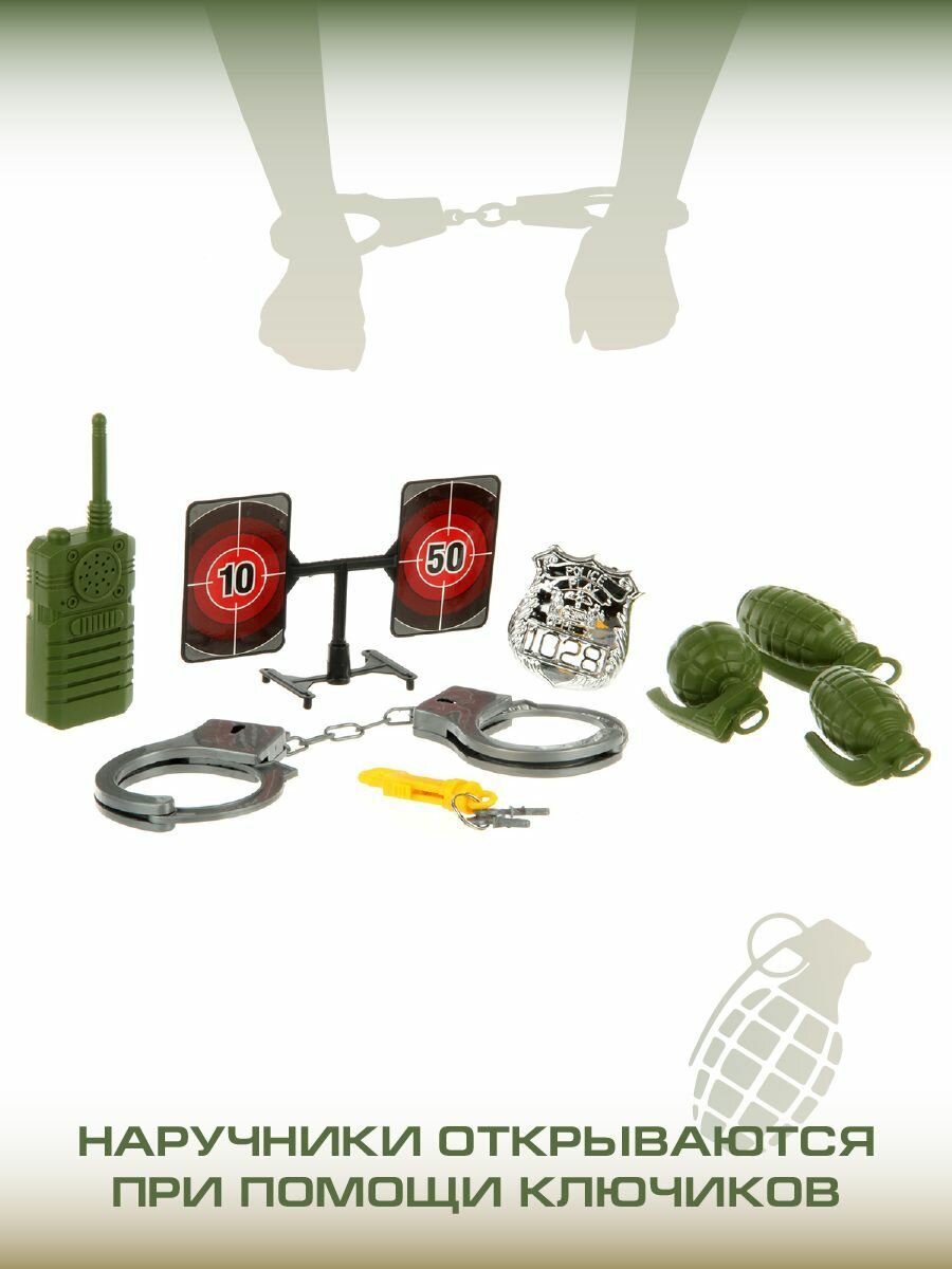 | Комплектация | игрушечное ружье, муляж рации, мишень на подставке, наручники, ключи к наручникам на карабине, жетон, 3 муляжа гранат, каска, обойма со снарядами, 5 снарядов на присоске |