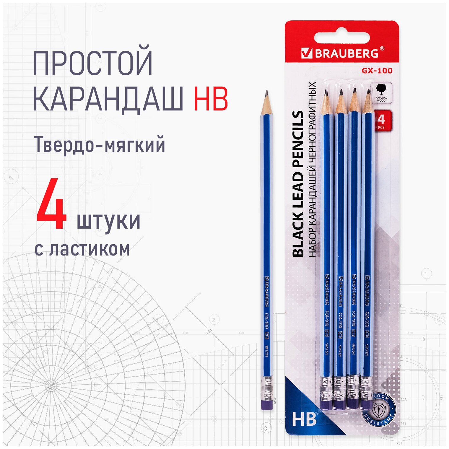 10 цен на Карандаши простые чернографитные Brauberg Gx-100 4 шт, HB, с ластиком, корпус синий, 181721
