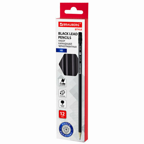 Набор карандашей чернографитных BRAUBERG "Style" 12 шт, HB, с ластиком, корпус черно-серый, 181719 информация: