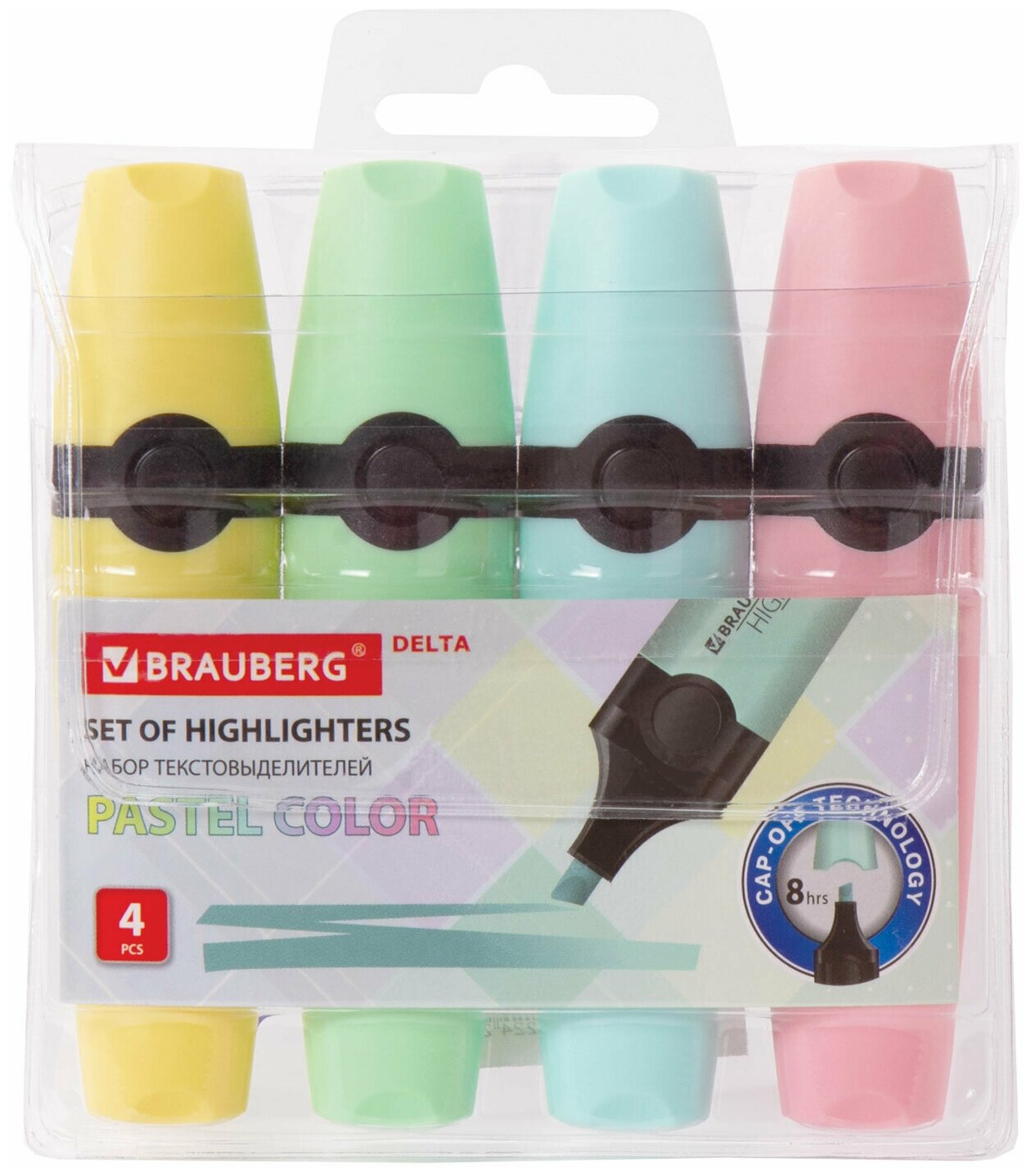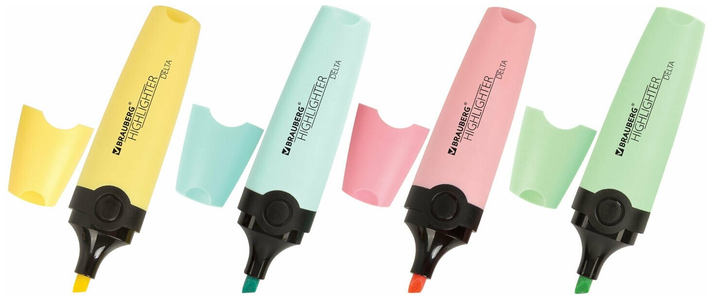 10 цен на Маркер-текстовыделитель (для выделения текста) Brauberg "Delta Pastel", набор из 4 штук, ассорти цветов, линия 1-5 мм, 151735