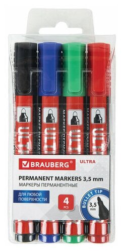 Маркеры перманентные BRAUBERG ULTRA MARKER, набор 4 цвета, круглый наконечник 3,5мм, 152208