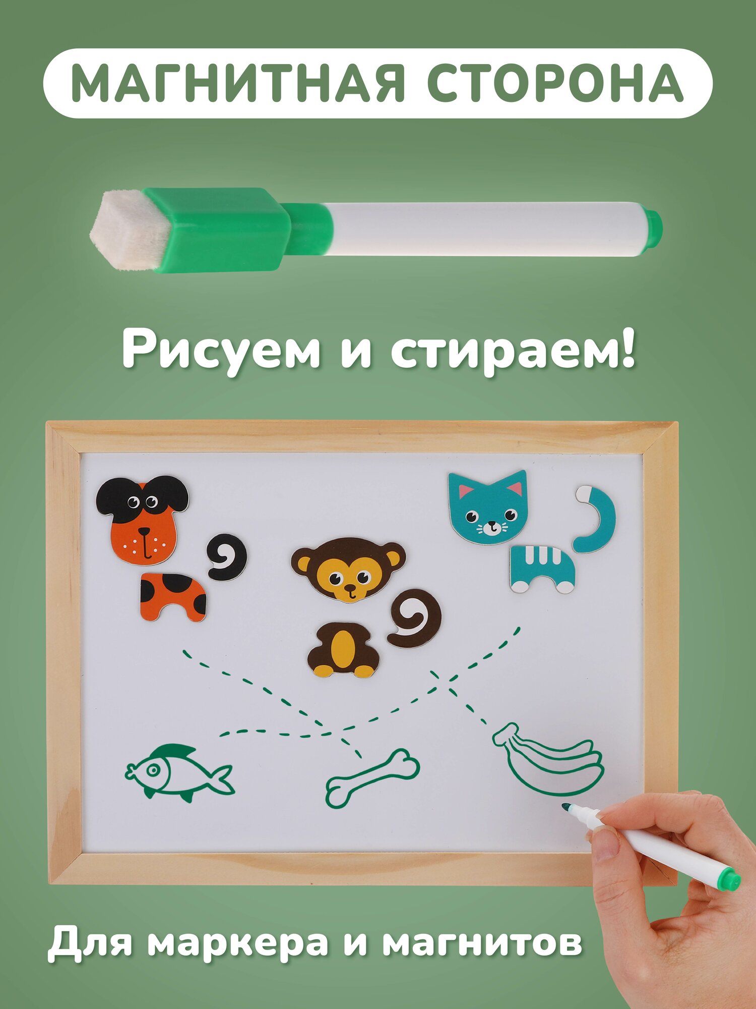 | В комплект входит | детали на магнитах в виде букв русского алфавита, цифр, животных и фруктов, мелки, маркер |