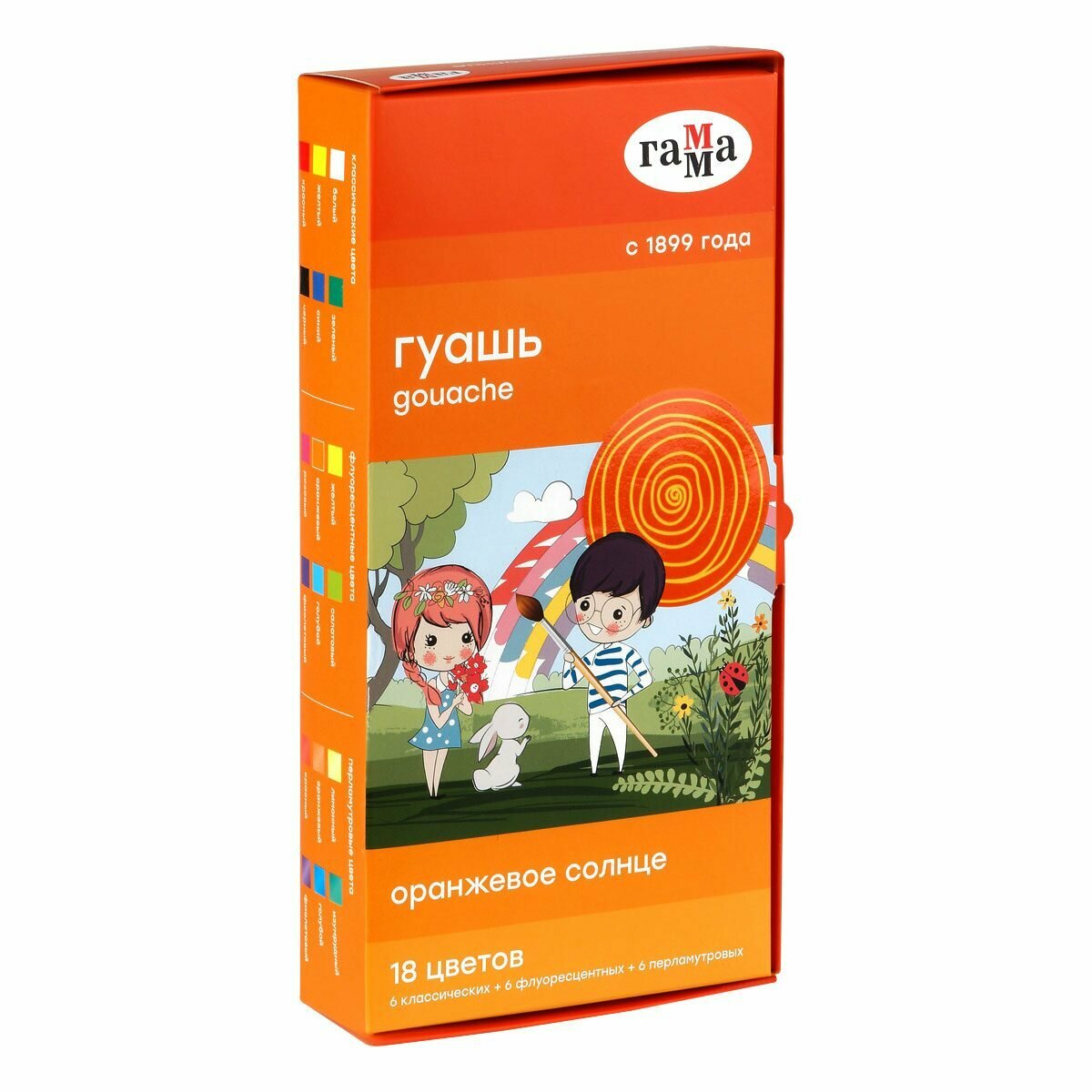 Гуашь 18 цветов Гамма "Оранжевое солнце", 6 перламутр.+ 6 классич.+ 6 флуор, картон, 4 уп. (200821.03) информация: