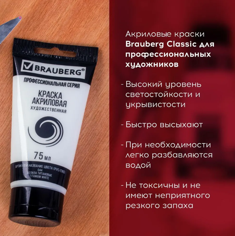 BRAUBERG Краска акриловая художественная Classic (профессиональная серия), 75 мл, белила титановые