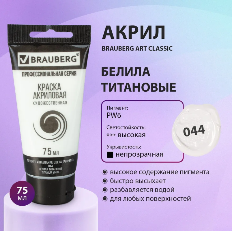 Отзывы на Краски акриловые художественные Brauberg ART Classic профессиональные для рисования 2 штуки, тубы 75мл, белила титановые