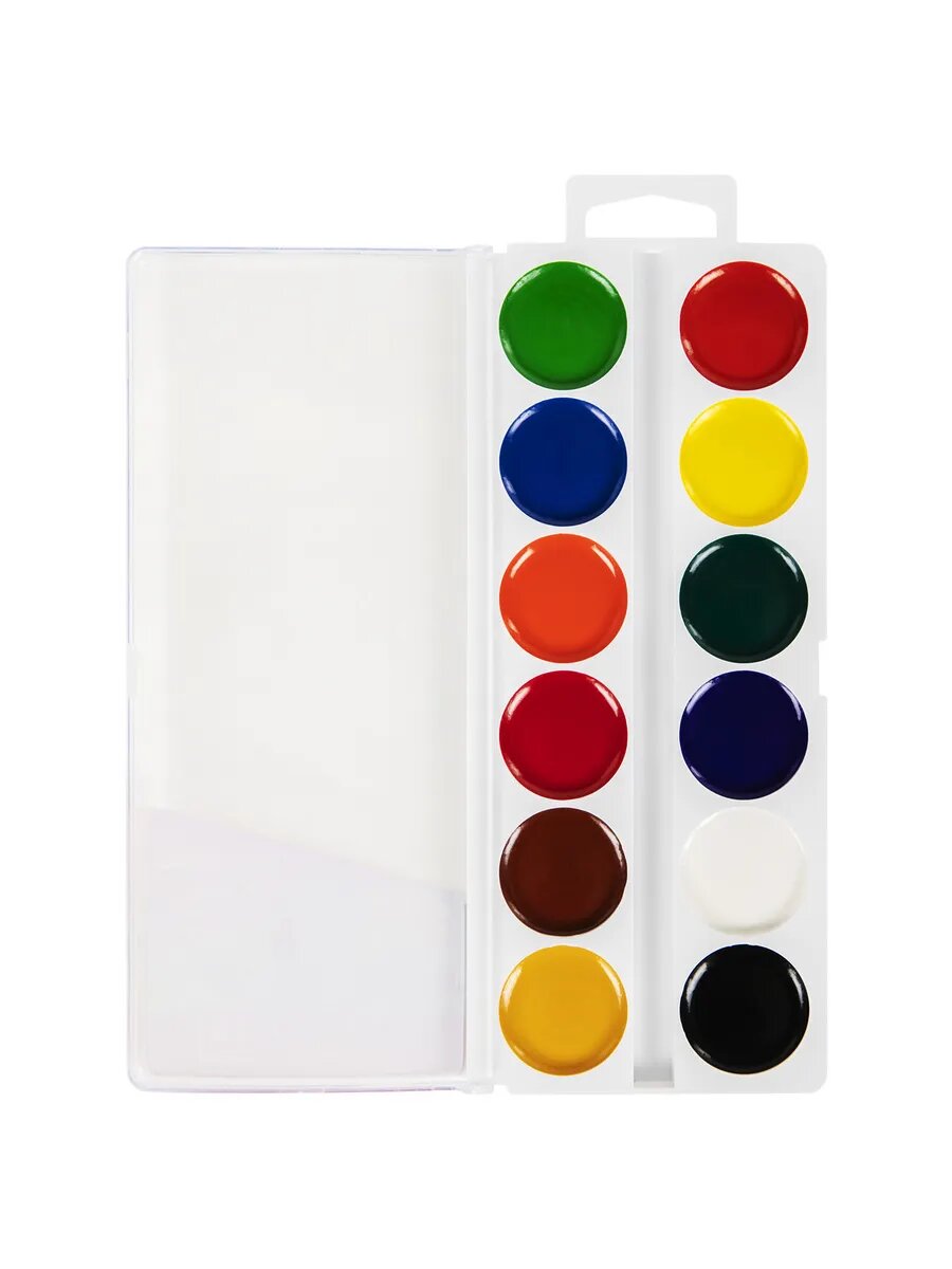 Краски акварельные для рисования, акварель для школы 12 цветов в круглых кюветах, пластиковый пенал, с кистью, Brauberg Kids, 191806