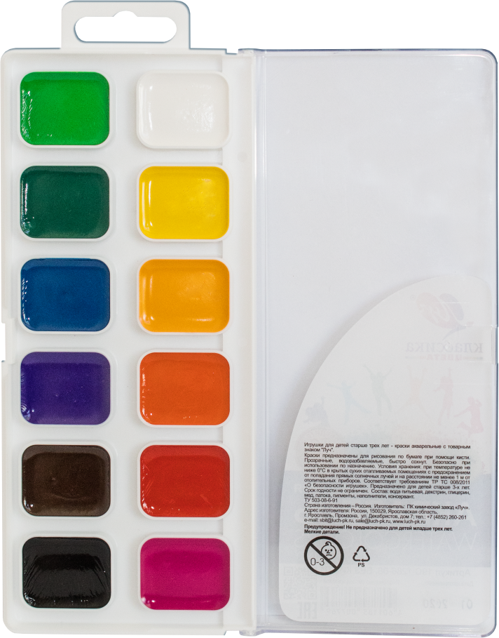 | Комплектация | 1 набор акварельных красок на 12 цветов |