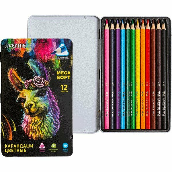 DeVENTE Карандаши 12 цветов, deVENTE Trio Mega Soft, трёхграннный корпус, 4M, 3 мм, металлическая подарочная коробка