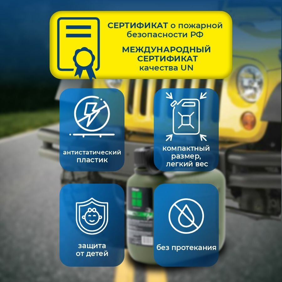 | Дополнительная информация | Все канистры снабжены крышкой с замком, предотвращающим случайное открытие и гибким гофрированным носиком, с системой "антибульк", для удобной заливки топлива через горловину бензобака автомобиля. |