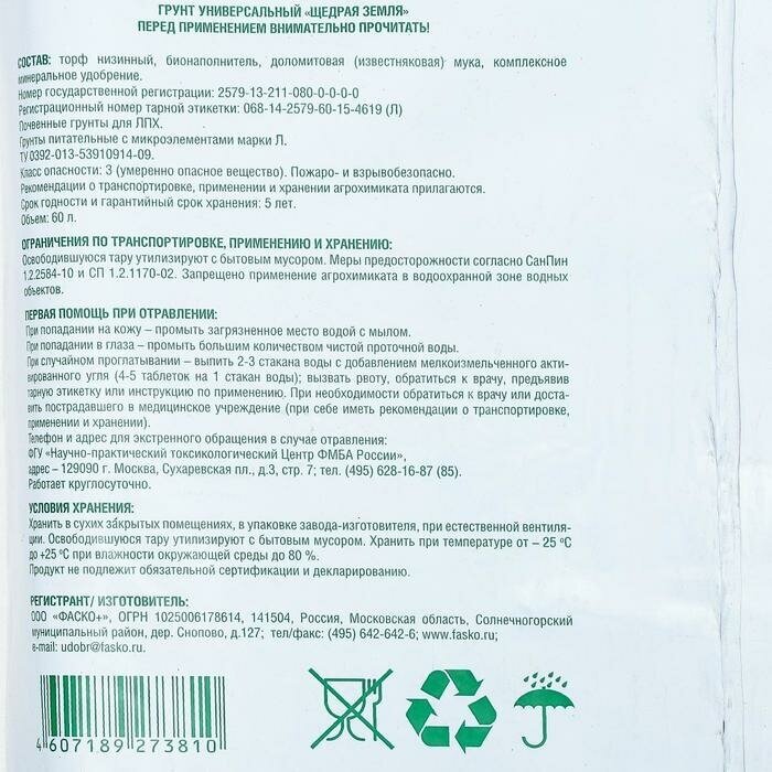| Состав | Грунт Щедрая Земля универсальный, 60 л, 20.3 кг |
