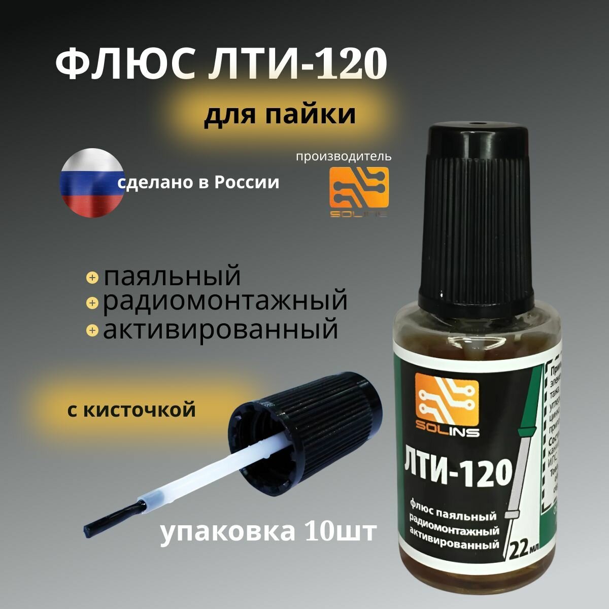 10 цен на Флюс для пайки "ЛТИ-120" Solins, канифоль, с кисточкой, ПЭТ флакон, 22мл, 10шт.