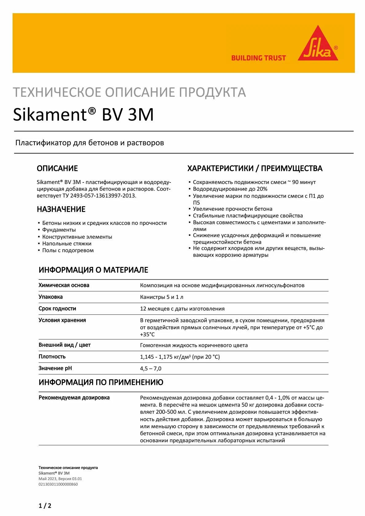 Sikament BV 3M Пластифицирующая и водоредуцирующая добавка для бетонов и растворов 1л информация: