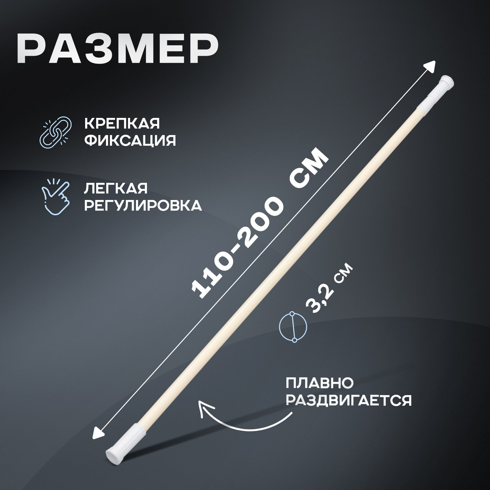 | Дополнительная информация | Установить этот карниз невероятно просто благодаря удобному механизму раскручивания. Просто закрепите один конец на стене и раскрутите другой до нужной длины, а затем сделайте еще пару оборотов для надежной фиксации. |