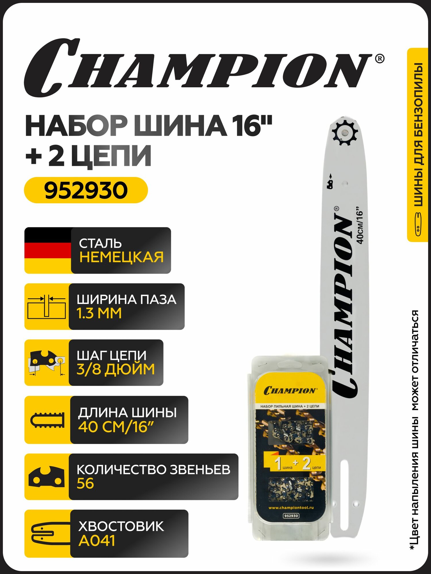 Набор Champion: шина CHAMPION 16" (3/8-1,3-56зв) + 2 цепи, арт. 952930 / Шина на бензопилу информация: