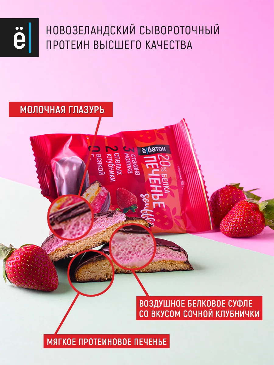 Протеиновое печенье "ё/батон" с белковым суфле 20% белка, со вкусом клубники, 50гр., 4шт