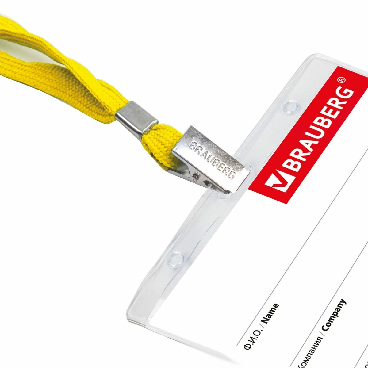 Бейдж горизонтальный Brauberg, 60х90мм, прозрачный, мягкий пластик, на желтой ленте 45см (231154), 20шт. информация: