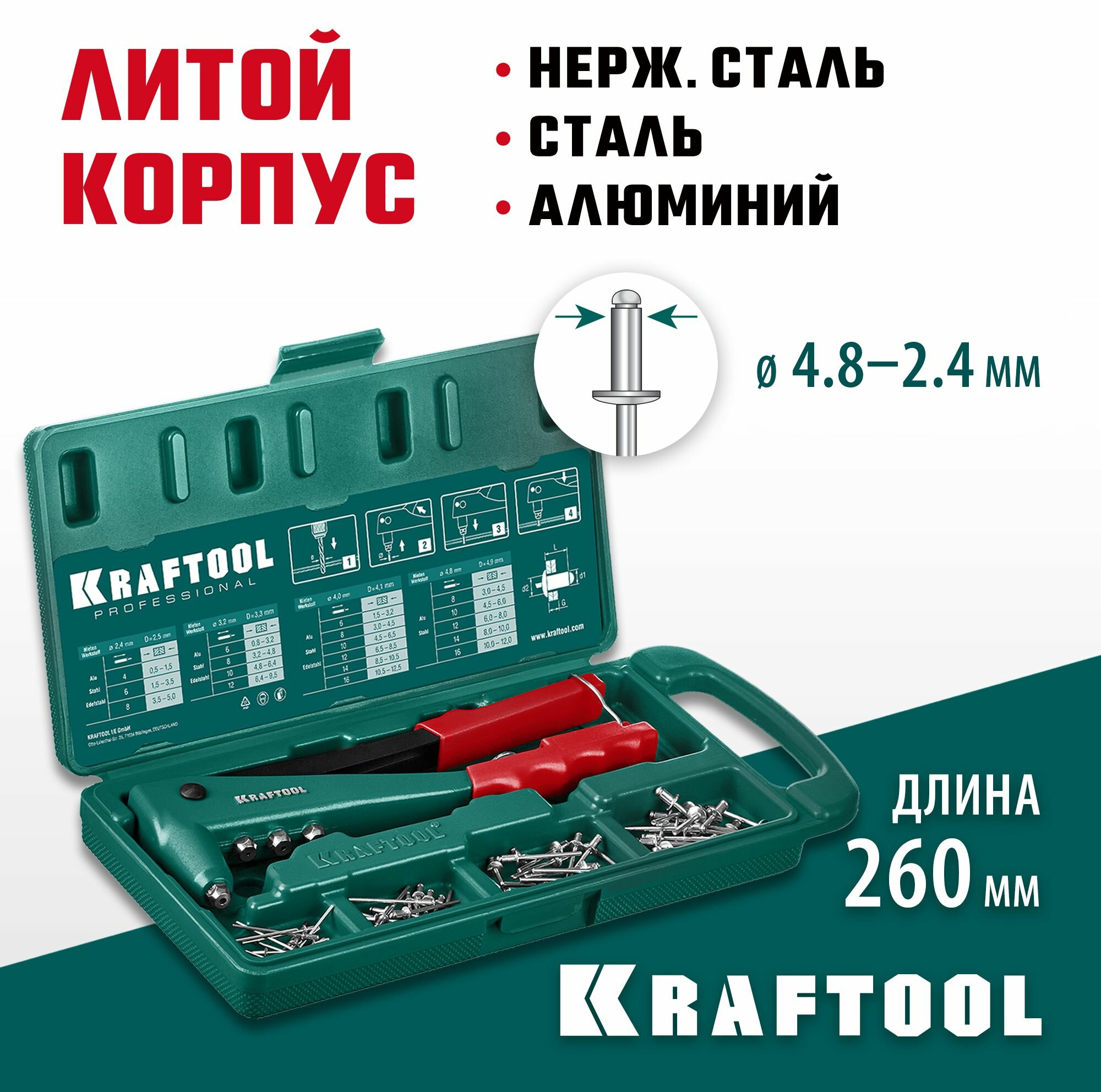 Литой заклепочник в кейсе KRAFTOOL X-3, 2.4 - 4.8 мм (31170-H6) информация: